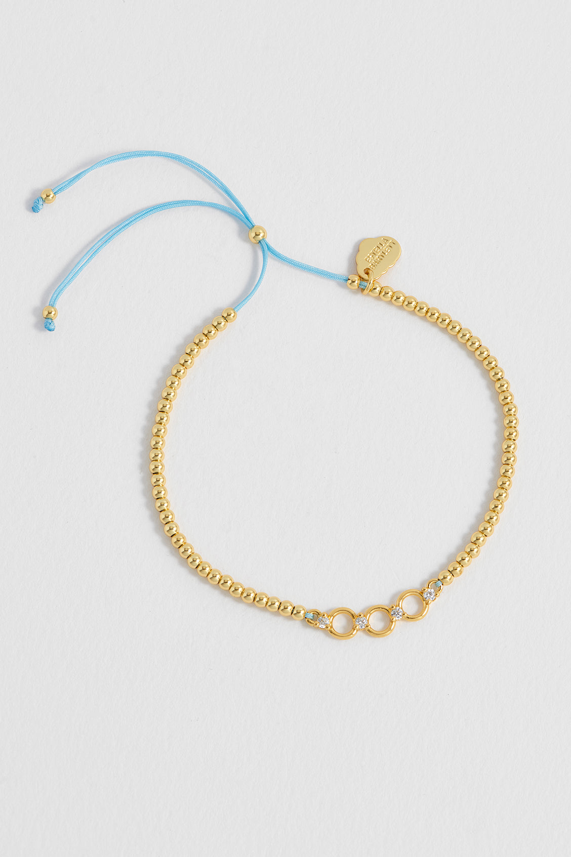 Shine on with our Triple Disc CZ Louise Bracelet. Featuring small circles complemented by CZ stones and paired with dainty gold-plated beads that move freely along the blue thread, this bracelet brings a discreet sparkle to your look. Thanks to its adjustable slider, it makes a perfect gift.
