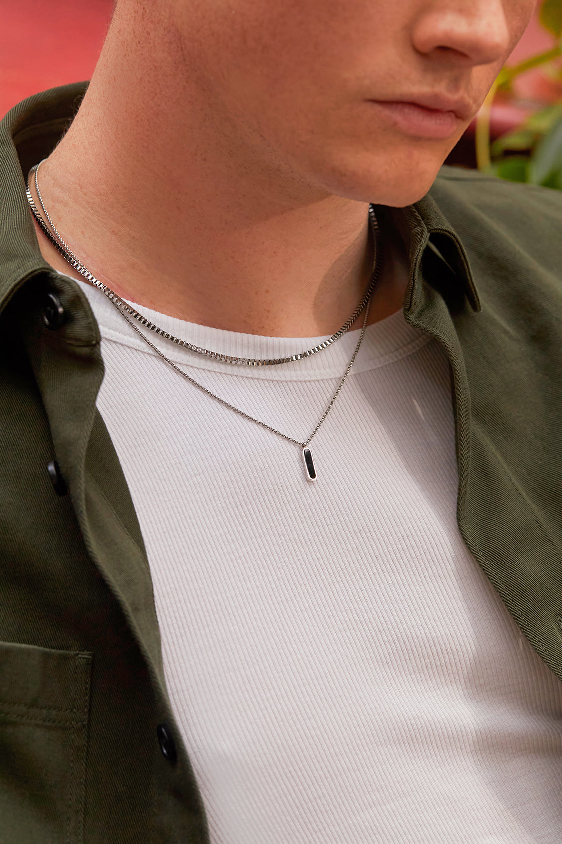 Our gemstone tag necklace features a black onyx pendant, known as the stone of strength, is set in stainless steel plating.