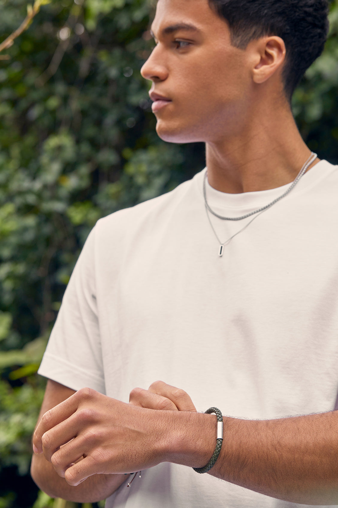 Our stainless steel Leather Single Plaited Bracelet is the perfect everyday piece that can be styled with a variety of looks. Featuring khaki leather in a woven detail, this piece adds texture to whatever you're wearing.