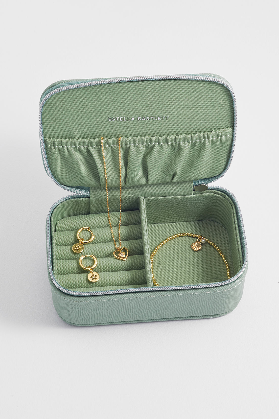 Our newest update to our best-selling Mini Jewellery Box! This style features a mint green grain exterior embossed with the inspiring message "Treasure Me" in silver foil. Inside, you'll find compartments to organise your bracelets, earrings and necklaces. With its petite size, this jewellery box is perfect for travelling or sitting on your dressing table.