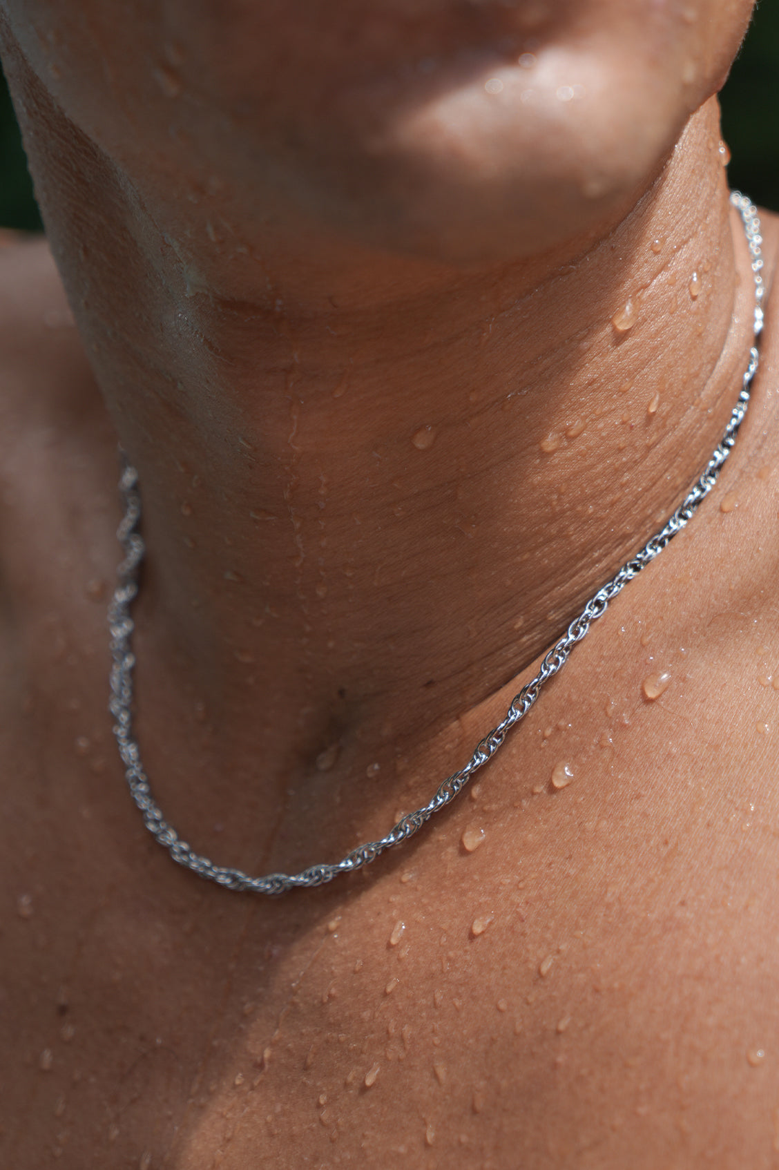 A simple chain which looks good on its own or layered with other necklaces. Our PVD rhodium-plated Rope Chain Necklace is crafted with interspersing rope-shaped links, making it a stylish and modern piece.