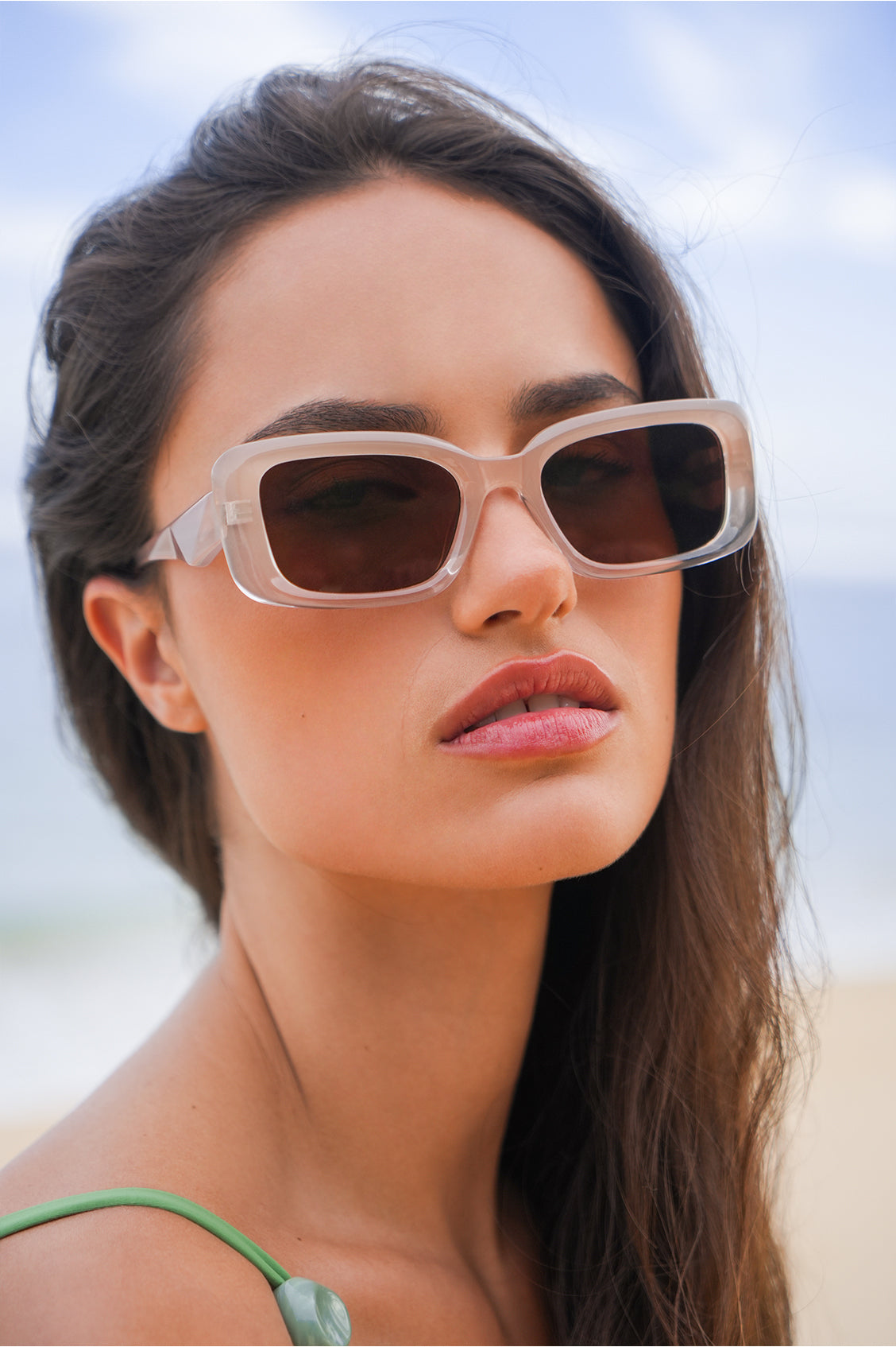 Women’s rectangle-shaped sunglasses in transparent champagne with brown lenses and a sleek, sculpted silhouette. A versatile style for everyday wear or holidays, with UV400 protection.