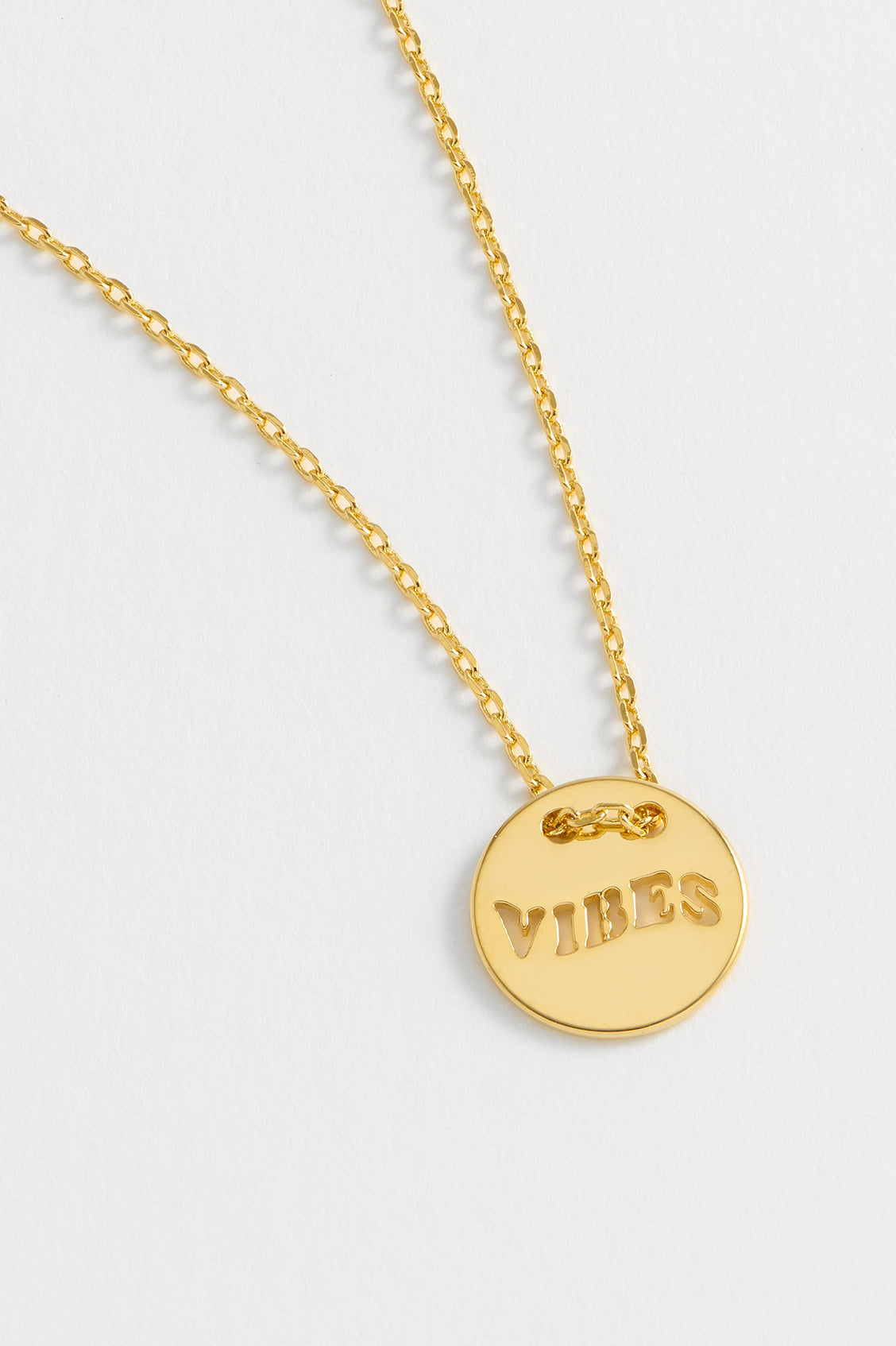 Good vibes only. Our gold plated Vibes Cut Out Disc Necklace is the perfect accessory for those who want to spread the positive vibes. Alternatively, gift this necklace to your loved ones to share your positive energy.
