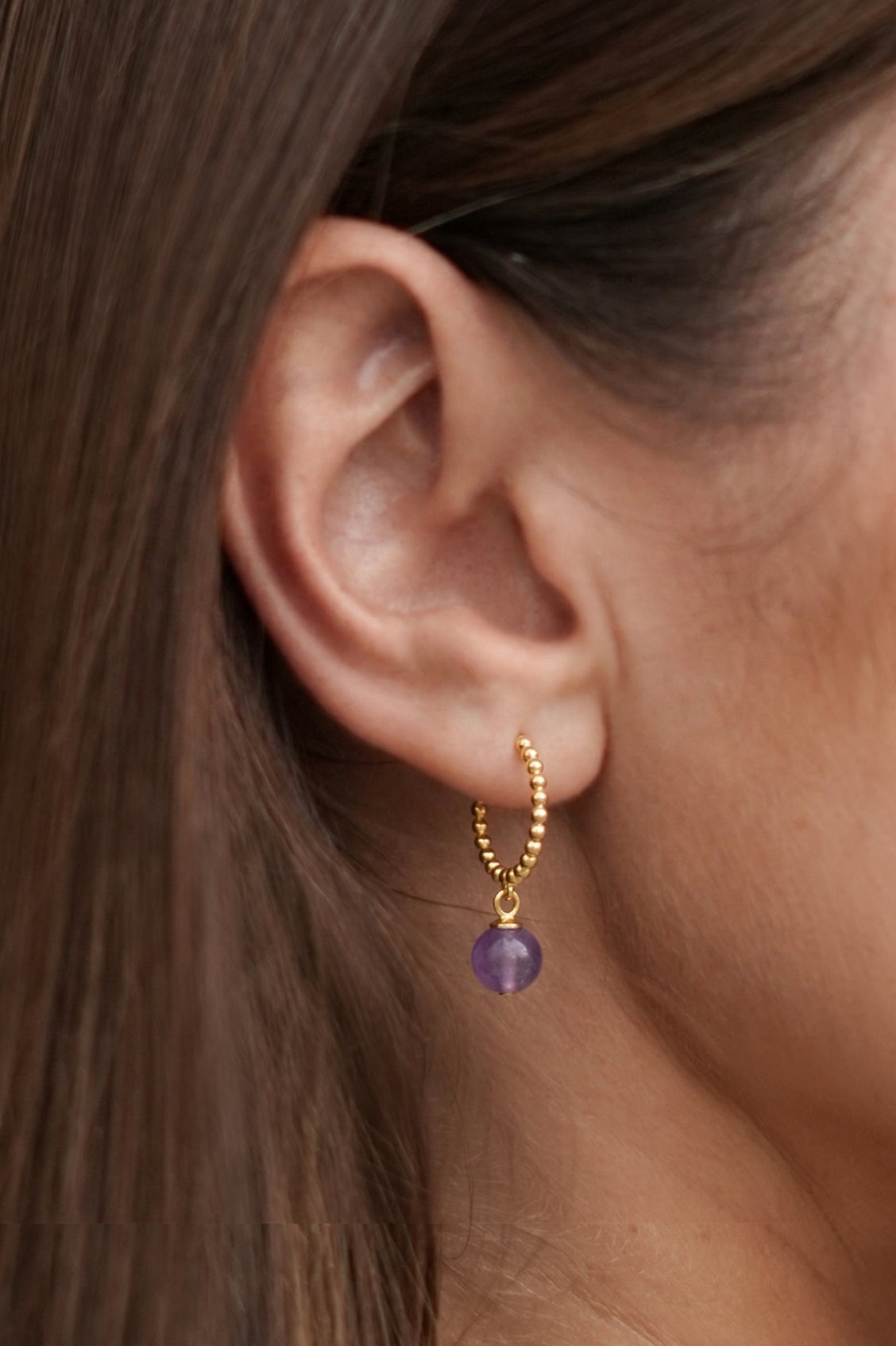 Featuring a unique beaded texture and finished with a beautiful Amethyst charm, our gold-plated Amethyst Gemstone Drop Hoop Earrings bring a meaningful update to this classic earring style. Often used in ancient Greece, Amethyst is thought to clear the mind, helping the wearer with decision-making.