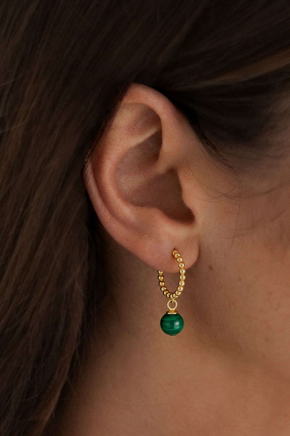 Featuring a unique beaded texture and finished with a beautiful Malachite charm, our gold-plated Malachite Gemstone Drop Hoop Earrings bring a meaningful update to this classic earring style. Said to embody joy, Malachite's rejuvenating green hues are believed to bring positive energy and protection.