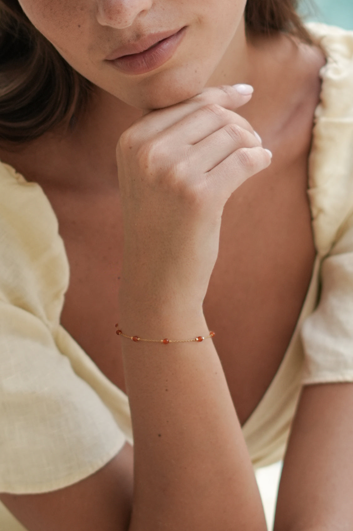 The perfect match with our best-selling Wellness Red Agate Beaded Chain Necklace, our dainty gold-plated Red Agate Beaded Chain Bracelet is the best choice for when you're looking to add a meaningful pop of colour to your outfit. Featuring a thin chain intercalated with round Red Agate gemstone beads, said to promote empowerment and strength, you'll reach for this bracelet again and again.