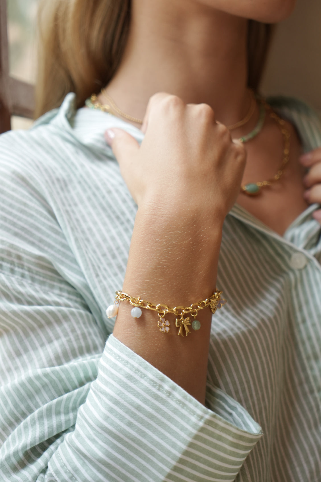 Absolutely charming! Our vintage-inspired, on-trend gold-plated Pastel Charm T-Bar Bracelet features a gold-plated chain with fun flower, bow, butterfly and gemstone charms – including jade, freshwater pearl, and green aventurine. It's the perfect accessory to add a nostalgic, colourful touch to your outfit.