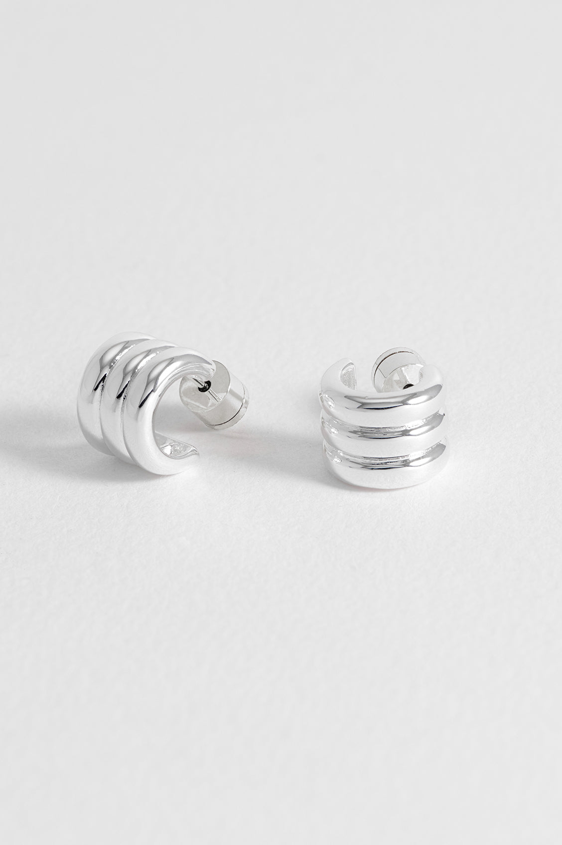 Featuring a distinctive ridged texture, our silver-plated Triple Cuff Hoop Earrings look great on their own or as part of your earring stack. Their minimalist yet striking design will elevate any outfit.